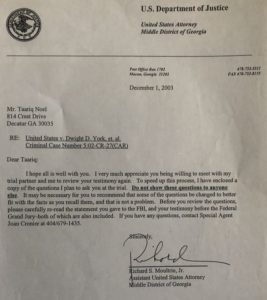Later a letter is sent to Taariq Noel by the United States Department of Justice Assistant United States Attorney for the Middle District, Richard Moultrie, in which he states: